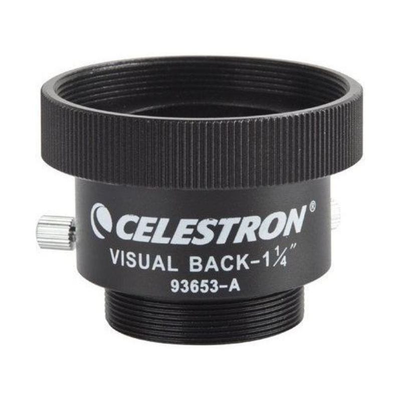 A Visual Back is a metal adapter that screws onto the standard rear cell threads of Schmidt-Cassegrain and Maksutov-Cassegrain telescopes and accepts 1.25” accessories, including diagonals, eyepieces (for straight-through viewing), Barlows, webcams, and any other accessory with a 1.25” insert barrel.